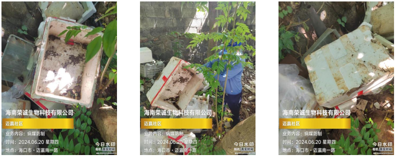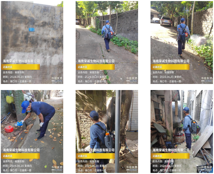 积极响应“清洁家园防蚊灭蚊”活动,对琼山区迈瀛社区持续消杀工作,翻盆倒罐、清除积水,使用超低容量、喷洒化学药物防治、积水处投放灭杀幼虫颗、防止反弹,做到不漏死角。